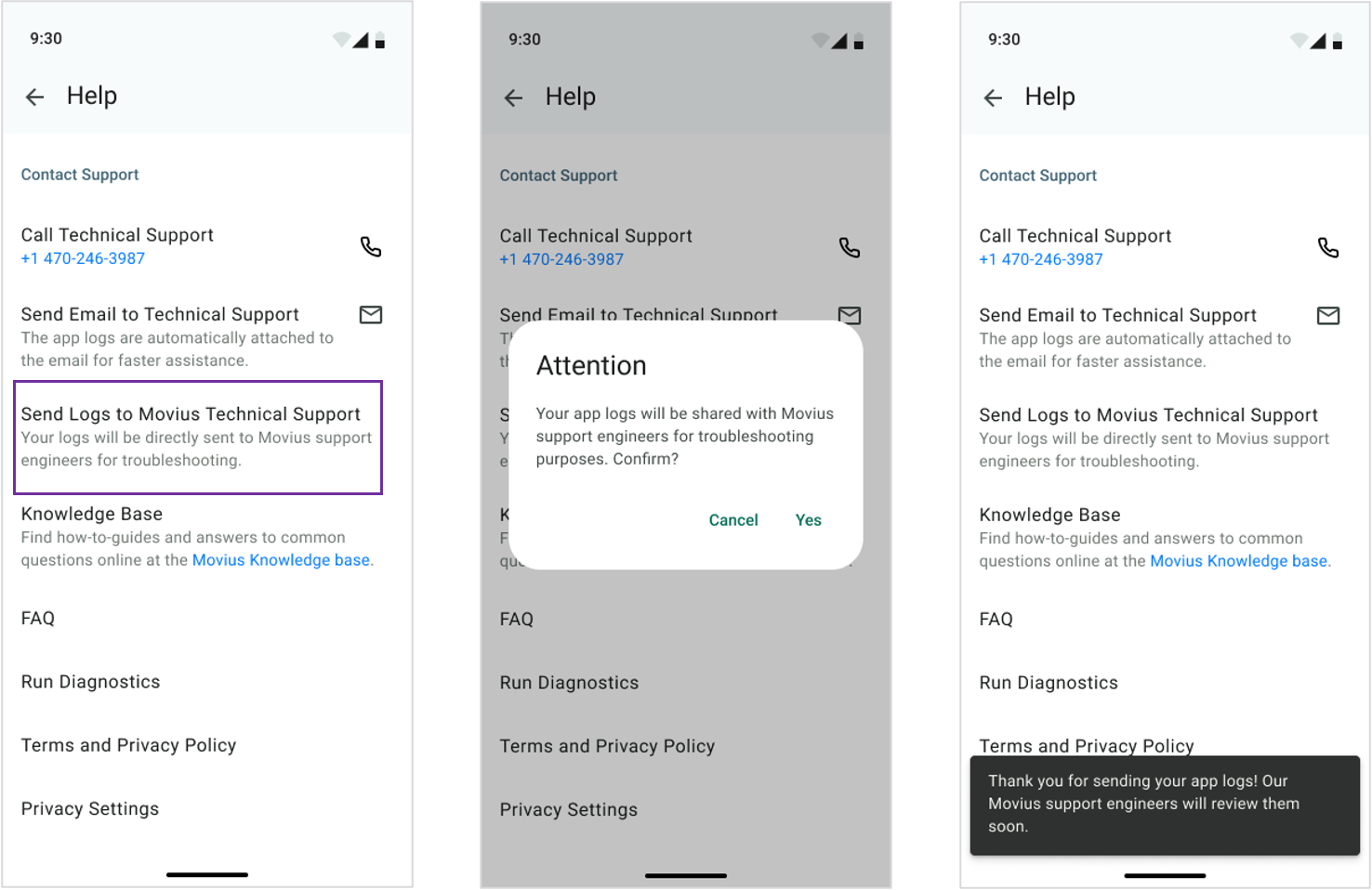 - If automatic upload is unavailable, users can still manually share logs via email or directly with Movius support