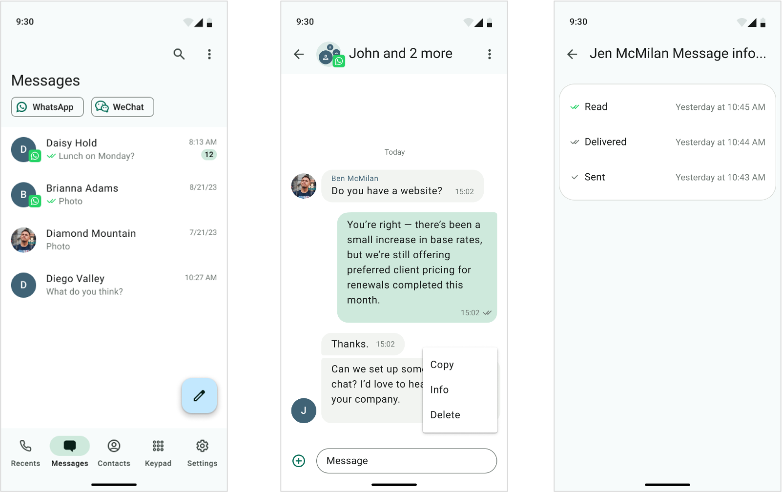- Message states mirror native WhatsApp behavior: Delivered, Read